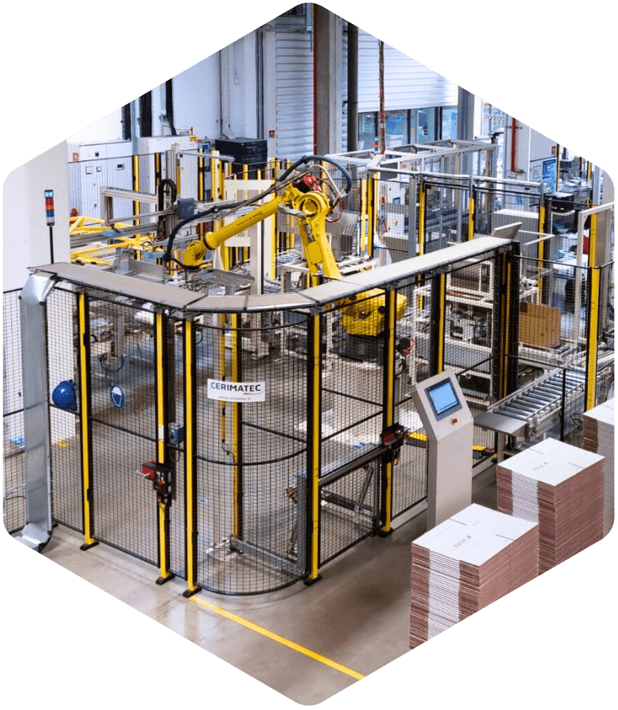 CERIMATEC conçoit et intègre des lignes automatisées à haute cadence, des process spécifiques (assemblage, contrôle, ergonomie) et des solutions standards innovantes comme le robot collaboratif de palettisation S:PAL, alliant innovation, fiabilité et efficacité opérationnelle.