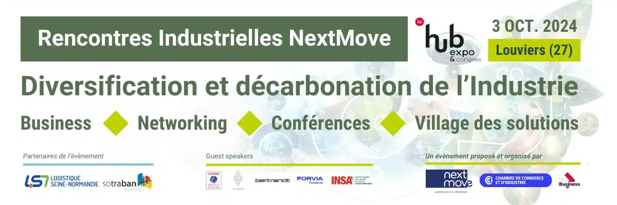 NextMove en partenariat avec le réseau des CCI de Normandie, la Sotraban, et Logistique Seine Normandie organise la première édition des Rencontres Industrielles NextMove. Une journée axée sur la Diversification et la Décarbonation de l’Industrie avec la présence de Grands Comptes industriels du secteur de l’Automobile, Transport et de l’Energie.