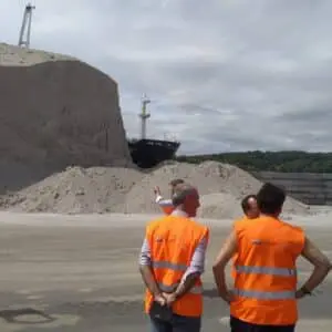 L’après-midi, la société Sea-Invest accueillait les services ministériels pour une visite guidée de leur site de Grand-Couronne. L’occasion de présenter Sea-Invest et de parler de leurs activités de manutention et de stockage de vracs solides et liquides. L’entreprise, historiquement tournée vers la gestion de charbon, est un exemple en matière de reconversion de modèle économique dû à la transition énergétique en œuvre. Elle réalise également une partie de son activité via des modes multimodaux : maritime, fluvial et fer, grâce notamment à leur 3 quais et à leur installation terminale embranchée (ITE) financée dans le cadre du plan France Relance avec l’aide de la Région Normandie.